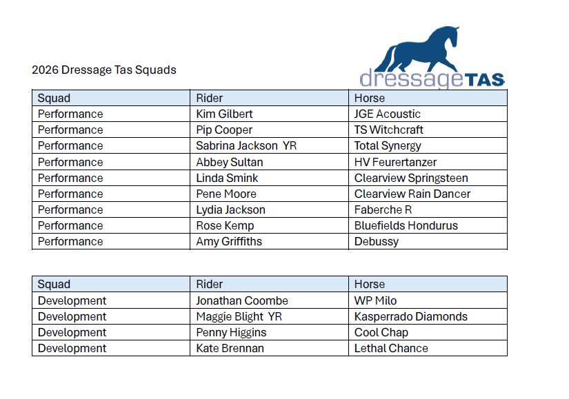 Dressage Tas is pleased to announce the 2026 DTAS Squads – Performance and Development. Congratulations to all squad riders and their horses on achieving a position on the DTAS Squads.