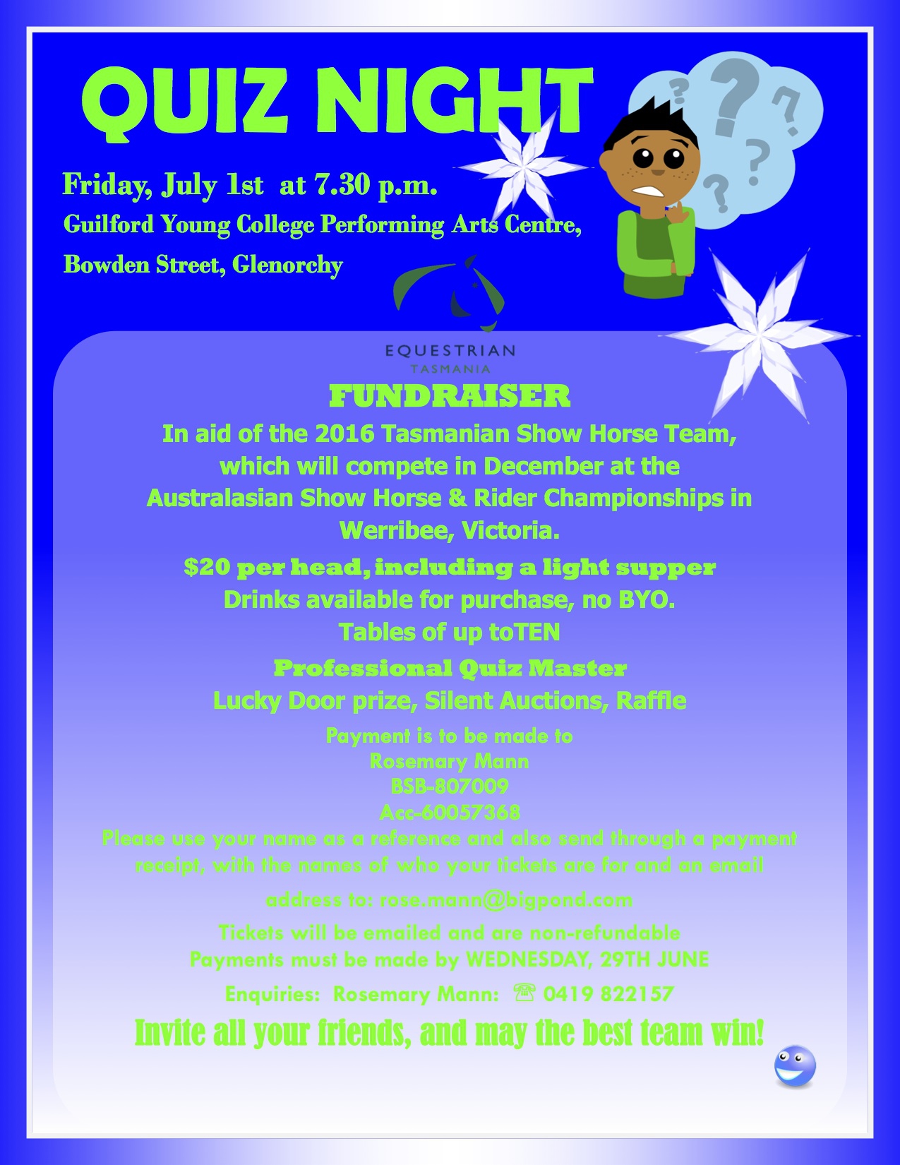 Tickets will be emailed and are non-refundable Payments must be made by WEDNESDAY, 29TH JUNE